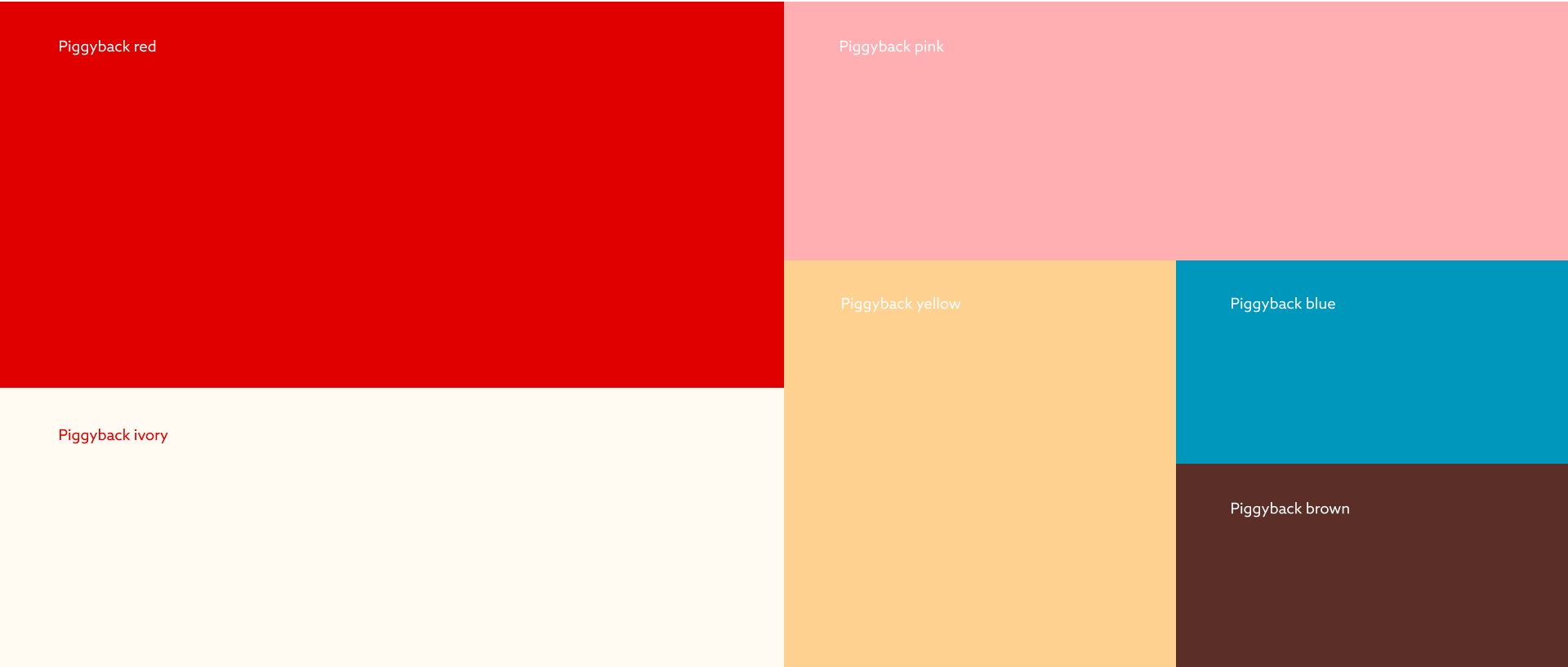 피기백의 컬러 팔레트는 아이를 품에 안고 업는 ‘어부바’의 감정을 바탕으로, 사랑(Piggyback red), 포근함(Piggyback pink), 따뜻한 일상(Piggyback yellow), 신뢰(Piggyback blue), 평범한 하루의 소중함(Piggyback brown), 그리고 그 모든 감정을 감싸는 여백(Piggyback ivory)으로 구성되었습니다. 각 컬러는 ‘CARRY THE LOVE’라는 브랜드 메시지를 시각적으로 표현하며, 피기백이 지향하는 따뜻하고 사랑스러운 무드를 완성합니다.